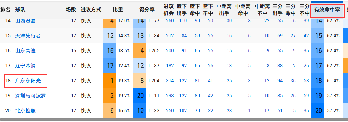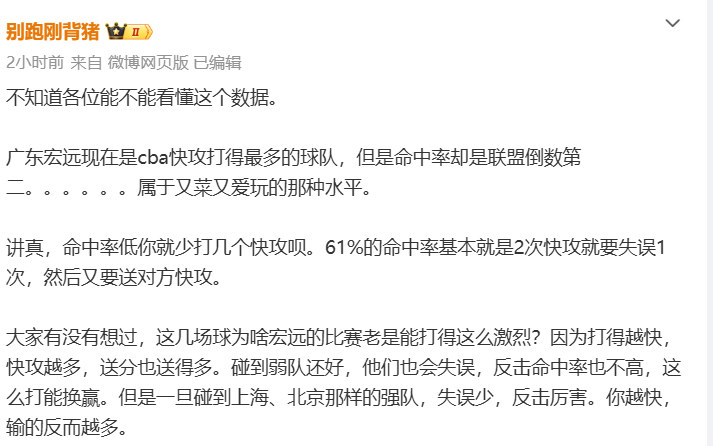 不妨来看看媒体人“别跑刚背猪”赛后给出的数据分析:广东宏远现在是cba快攻打得最多的球队,但是命中率却是联盟倒数第二。大家有没有想过,这几场球为啥宏远的比赛老是能打得这么激烈?因为打得越快,快攻越多,送分也送得多。碰到弱队还好,他们也会失误,反击命中率也不高,这么打能换赢。但是一旦碰到上海、北京那样的强队,失误少,反击厉害。你越快,输的反而越多。